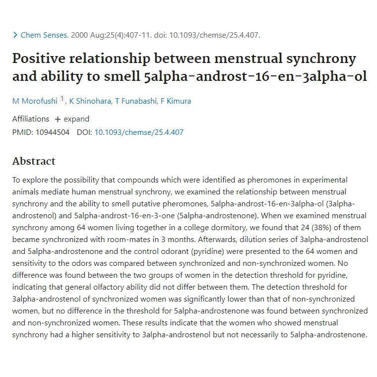 Ludzki androstenol jest wytwarzany wyłącznie w okresie dojrzewania. Związek ten odpowiada za zmianę poziomu hormonu luteinizującego w podwzgórzu [1], co ma wpływ na płodność kobiet. Wykazano również, że może zmieniać nastrój i przyczyniać się do pobudzenia seksualnego [2]. Pod wpływem androstenolu niektóre kobiety mogą postrzegać mężczyzn jako bardziej atrakcyjnych [3]. Co więcej, zaobserwowano, że aplikacja androstenolu na górną wargę sprawiała, iż część kobiet stawała się bardziej spokojna.